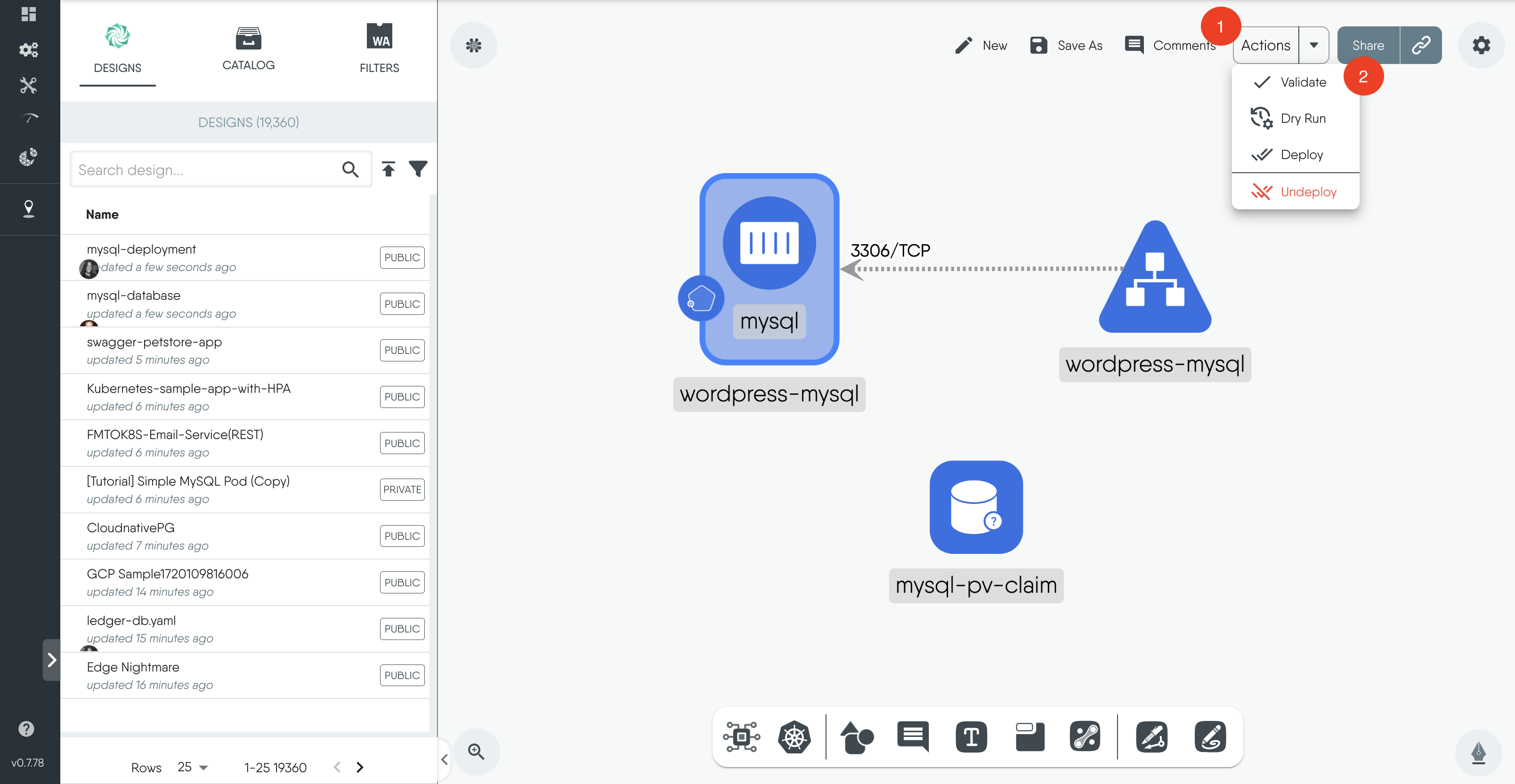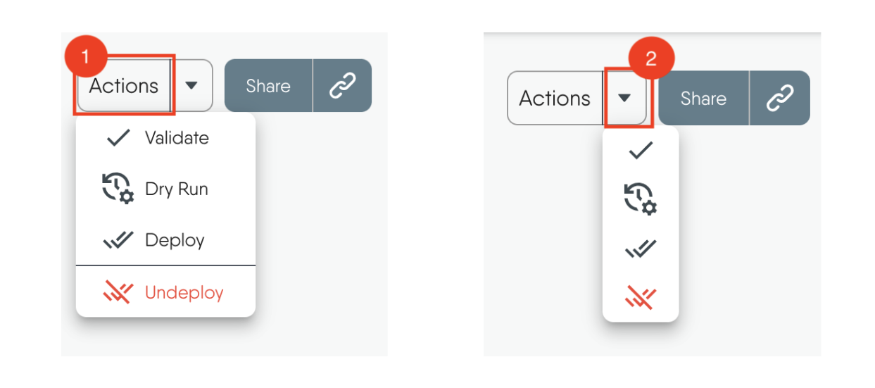 1. To deploy a design, navigate to the Actions button at the top of the Design canvas.