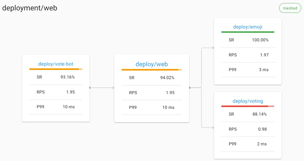 The first thing you'll see here is that the web deployment is taking traffic from vote-bot (a deployment included with emojivoto to continually generate a low level of live traffic). The web deployment also has two outgoing dependencies, emoji and voting.